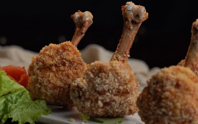 Bằng cách rút xương để tạo dáng tròn đều cho từng chiếc đùi gà thêm bắt mắt với trẻ, thêm gia vị và được áo đều trong lớp bột chiên xù dày vừa phải.