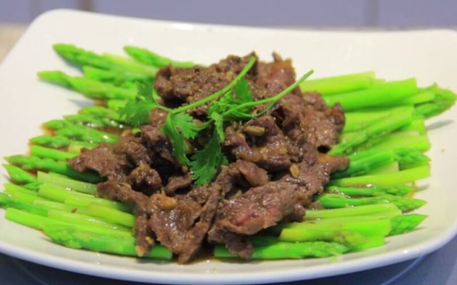 10. Trước khi thưởng thức, dọn bắp bò xào măng tây lên đĩa và trang trí bằng rau sống.