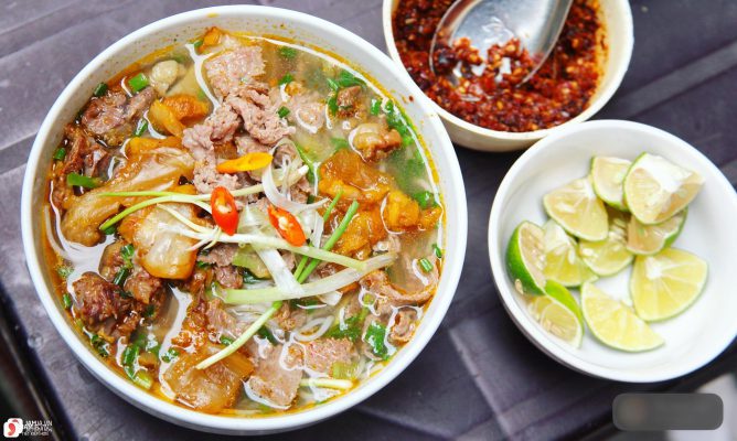 13. Thưởng thức bún nạm gầu bò tái cùng với nước mắm pha chua ngọt hoặc tương ớt, chanh và tỏi.